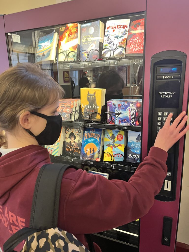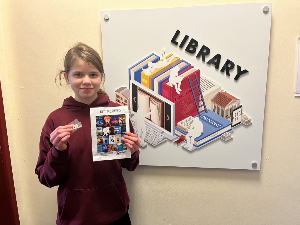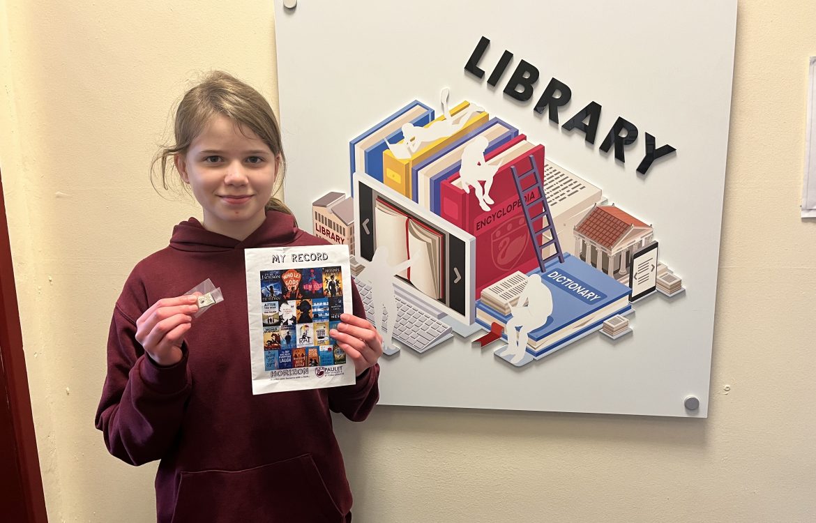 Lucy is the first student to complete our Horizon Challenge. She’s read six books from our chosen list and has been rewarded with an exclusive pin badge, certificate and a token for our book vending machine.  Well done Lucy! Keep reading!Â