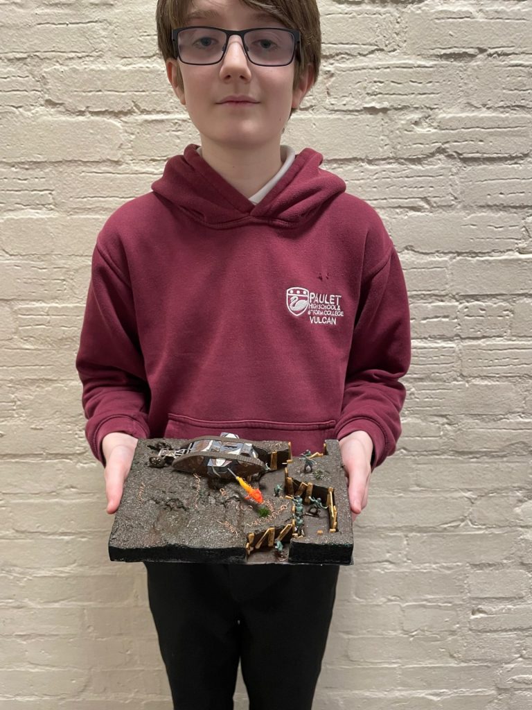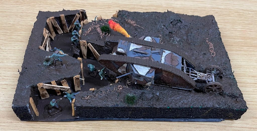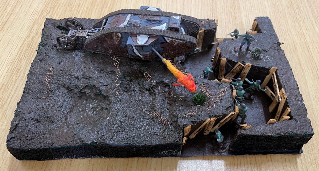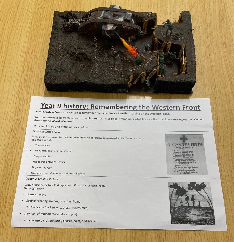Well done to Nick in Year 9 for producing an excellent diorama as part of his history home learning. His model depicts a British tank advancing on a German trench and was created to commemorate the Western Front.