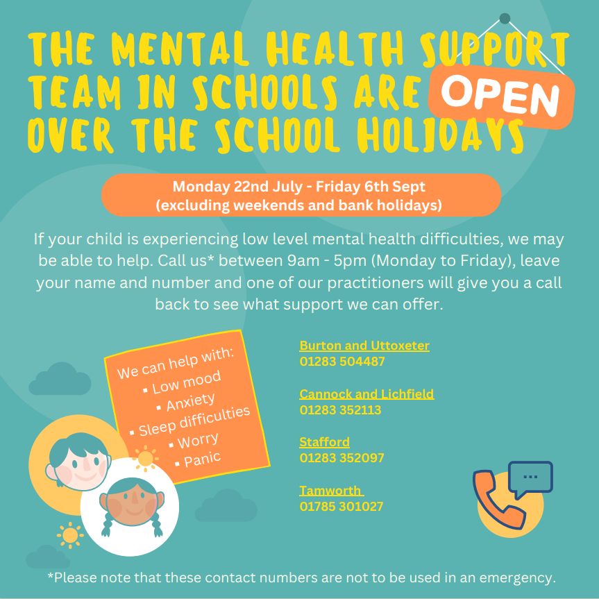 We would like to remind you that the Mental Health Support Team will remain open over the summer holidays and are accepting referrals during this time through the self-referral pathway (Monday 22nd July-Friday 6th September). Please see attached posters for more information on how to do this. All students on-roll at Paulet can access this support no matter your address or GP location. Please use the Burton and Uttoxeter contact details.