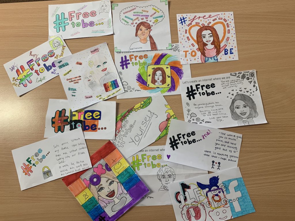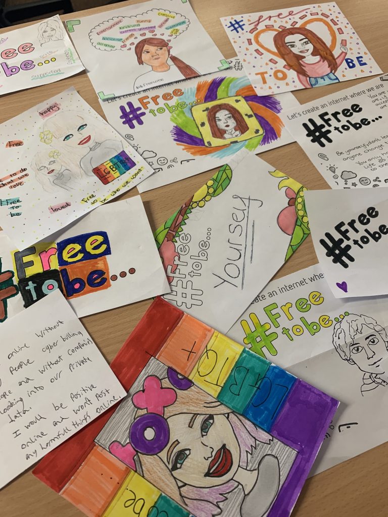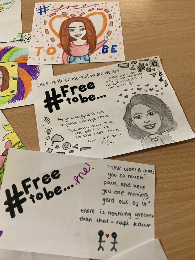 Students today were digging in to their online identity, we have been looking at surrounding ourselves with a positive outlook on the internet and how to stay safe online, creating a healthier environment and mental health surrounding social media. Students created some beautiful pieces of art based around the hashtag “freetobe”. #SaferInternetDay #freetobe @UK_SIC