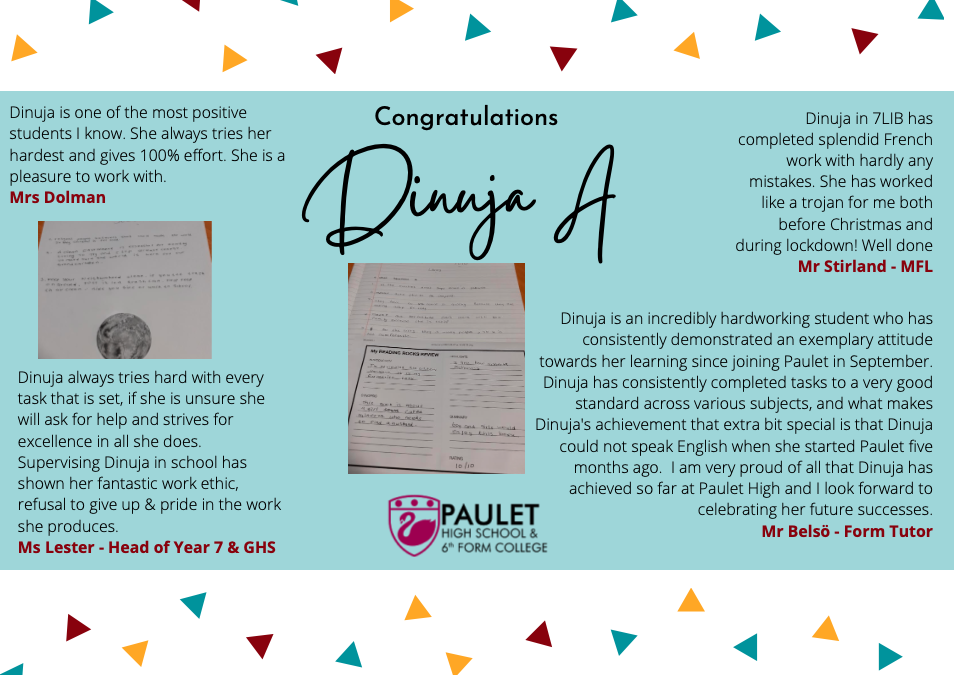 Well done to Dinuja A from 7LIB who has also been nominated as a