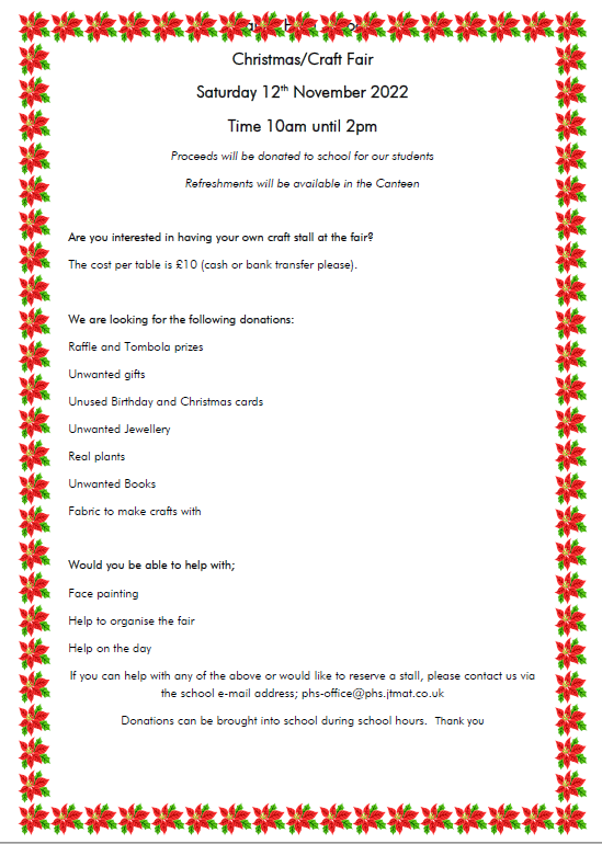 Save the date – Paulet Christmas Craft Fair on Saturday 12th November from 10am until 2pm. If you are interested in reserving a craft stall please email phs-office@phs.jtmat.co.uk