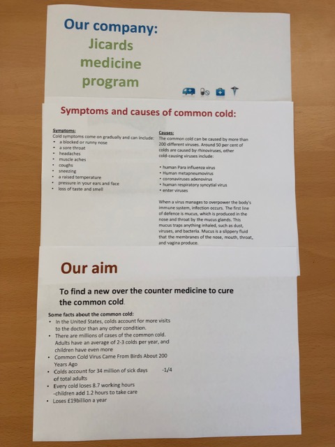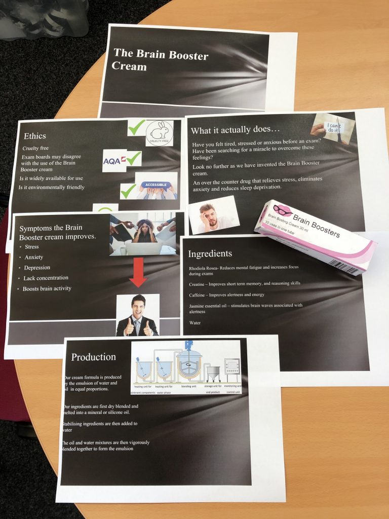 Great work from our Year 12 chemists as part of their Going for Green projects. Tasked with designing and marketing an over the counter drug; Ricards, Josh and Joe designed a cure for the common cold and Jack, Leah and Sara invented a brain booster cream. Mrs Downes is incredibly impressed with the detail of research and quality of presentations and has awarded lots of LORIC points! Well done all!