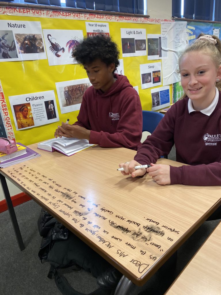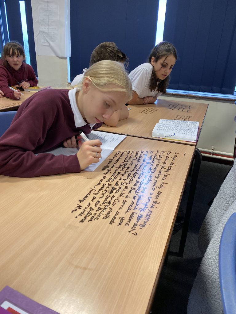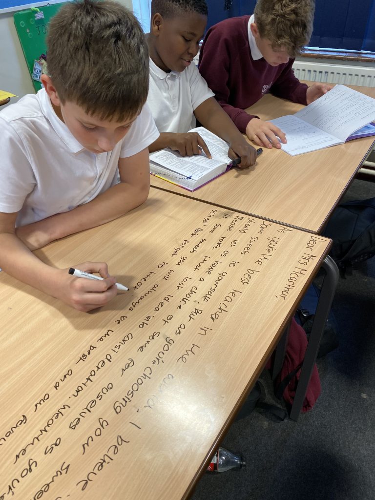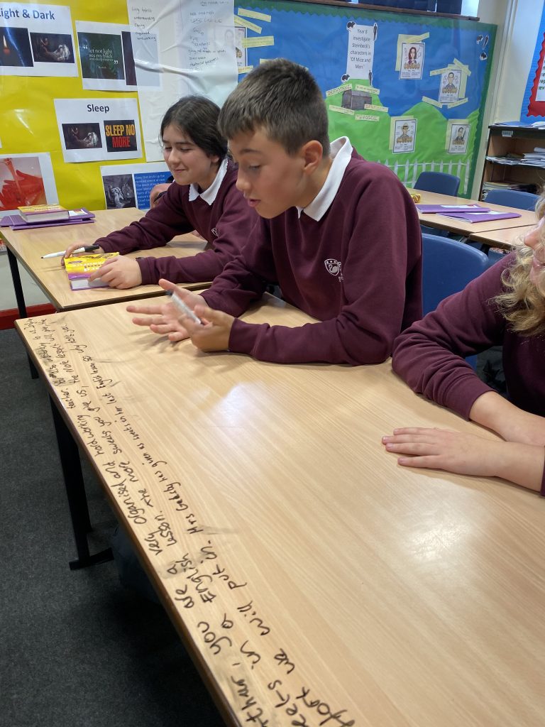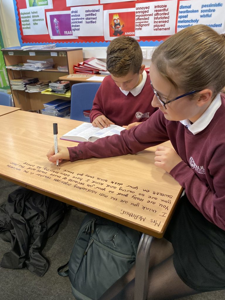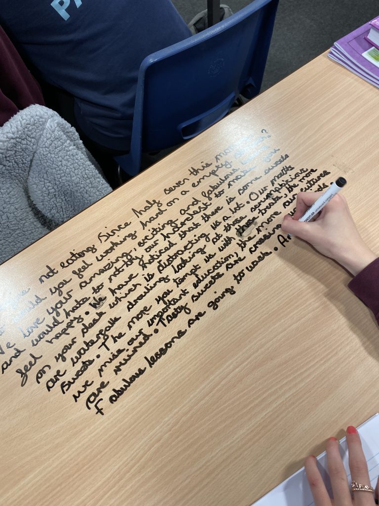 Has Mrs McArthur gone mad? No! She let Year 8 practise their persuasive writing skills on their desks today. They had to use a range of sentence patterns and flattery to earn some treats!
