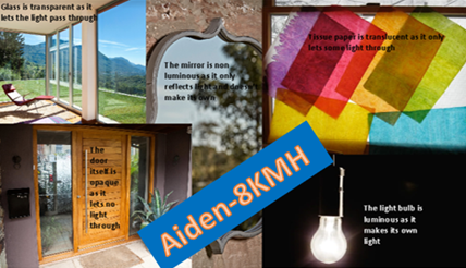 8KMH were investigating different ways light is transmitted, and went on a hunt to find a luminous, non-luminous, transparent, translucent and opaque object in their homes.